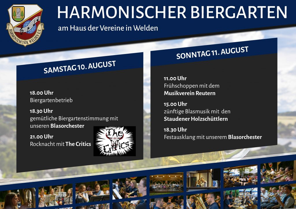 Am zweiten August Wochenende ist der Biergarten ebenfalls Samstag und Sonntag geöffnet. Den Auftakt am 10. August spielen ebenfalls die Musiker des Blasorchesters, bevor die Rockband „The Critics“ zur Rocknacht ordentlich einheizt – mitsingen, tanzen und Luftgitarre spielen ist absolut erlaubt und erwünscht.